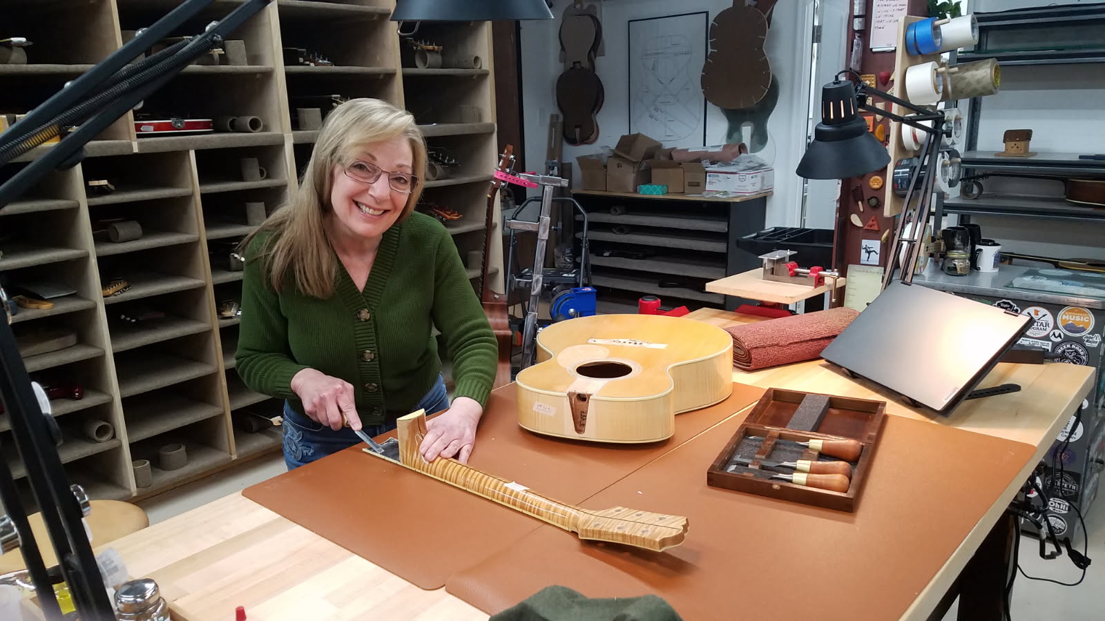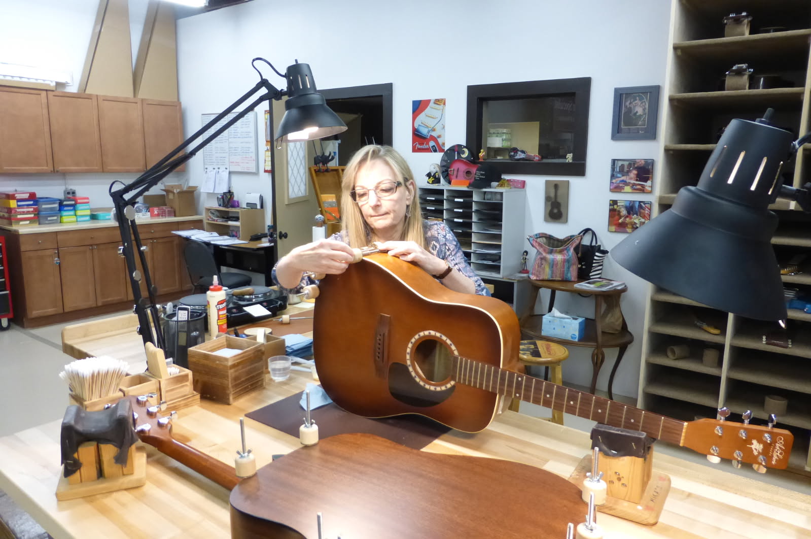 Their work and shop have been featured in Vintage Guitar Magazine, American Lutherie, and Guitarmaker Magazine. Doug has also appeared on Michael Bashkin’s Luthier on Luthier podcast. Together, Doug and Sharon have served as masterclass clinicians for the Luthiers Interactive of North Texas (LINT) and have presented at the Northwoods Seminars, where they taught advanced French-polishing techniques for repair and restoration.